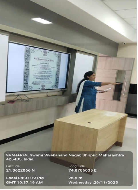 The Constitution Day celebration at Department of Computer Engineering was conducted on 26 November 2025 with great enthusiasm. The program began with a welcome address followed by the Importance of Constitution Day. A brief talk was delivered by Dr. Puja D. Saraf, highlighting the historical background of the Constitution, contributions of Dr. B.R. Ambedkar, and the importance of constitutional values in modern society. All participants read the Preamble of the Indian Constitution together as part of the nationwide initiative. A special awareness session was organized on topics like: • Fundamental Rights and Duties • Role of Constitution in Democracy • Importance of Constitutional Morality