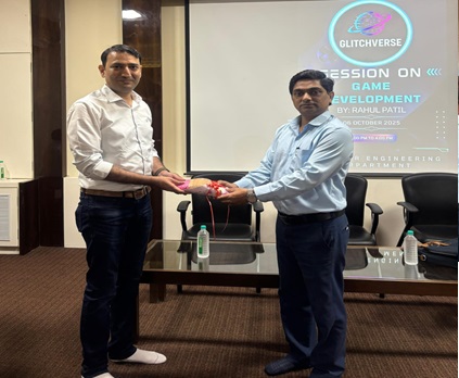 On 6th October 2025, the Glitchverse Club was inaugurated in the college auditorium from 2 PM to 4 PM. A special session was organized by the Glitchverse Club on the topic "Roadmap to Becoming a Game Developer", conducted by an expert in the field. The event began with a brief introduction of the club by the club head, who explained the club’s vision, goals, and upcoming activities to the faculty members and students. The inauguration ceremony was officially done by the ribbon cutting, performed by Deputy Director Dr. P. J. Deore Sir. The event was attended by faculty members including, Dr. R. B. Wagh Sir (HOD of Computer Engineering Department), Mentor Dr. S. M. Pardeshi Sir, Pallavi Agrawal Mam and other faculty members. The club mainly consists of first-year students who had registered through a Google form. A total of 105 students attended the event. After the inauguration, a special session on game development was conducted by expert Mr. Rahul Patil Sir (Engineering manager in Helpshift- Keywords Studio). He explained key concepts of game development and shared practical knowledge with the students throughout the session. The session was well received, and students showed great interest and participation throughout. The entire event was successfully held in the college auditorium and marked a great start for the Glitchverse Club.