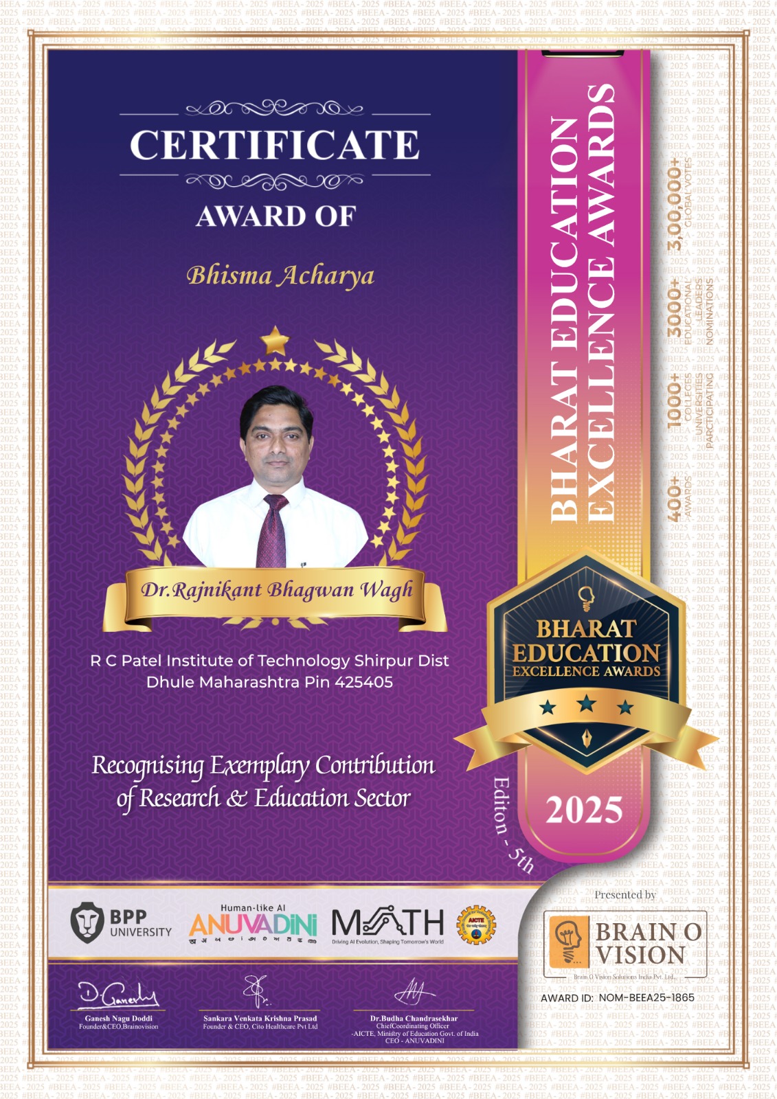 Dr. Rajnikant Bhagwan Wagh, , Associate Professor and Head, Department of Computer Engineering, has been honoured with the prestigious “Bhisma Acharya Award” at the Bharat Education Excellence Awards (BEEA) 2025, recognized and supported by AICTE and organized by Brainovision.This award acknowledges his outstanding contributions to academic excellence, innovation, and leadership in education.