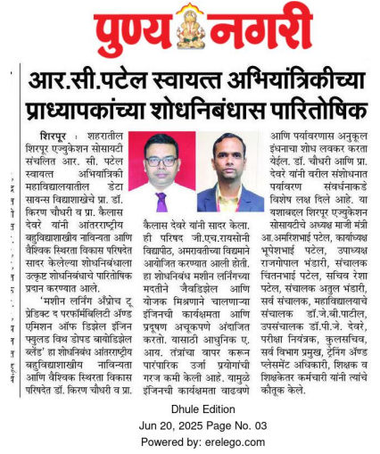 Faculty members of R.C. Patel Institute of Technology from Data Science department were honored for their outstanding research contributions. Their innovative work and published research papers received special recognition from the academic community. The institution appreciated their efforts in promoting a strong research culture and academic excellence. Senior authorities congratulated the faculty for their dedication and commitment to quality research. The recognition highlights the institute’s growing contribution to technological advancement and innovation. The event encouraged other faculty members to actively engage in research activities. This achievement further strengthens the institute’s reputation in higher education and research