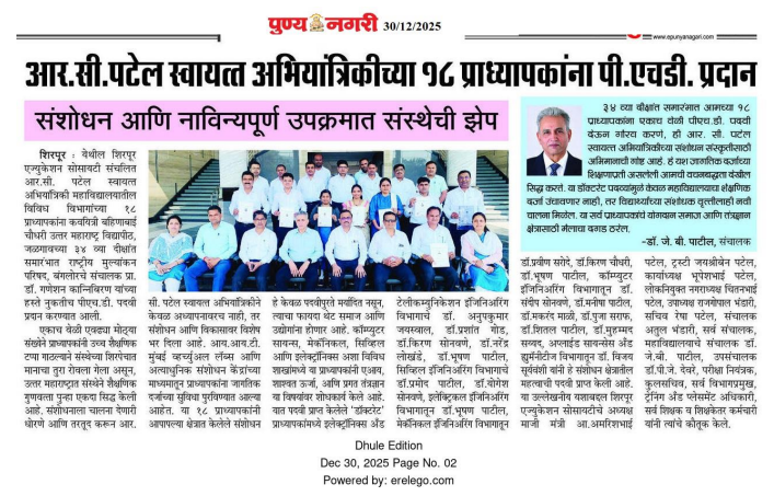 R.C. Patel Institute of Technology celebrated a proud academic achievement as 18 faculty members were awarded Ph.D. degrees. The recognition highlights the institute’s strong focus on research and innovation. A special felicitation program was organized to honor the achievements of these faculty members. Senior officials appreciated their dedication and contribution to academic excellence. The event emphasized the importance of research culture in higher education. Faculty members expressed gratitude for the support provided by the institution. This accomplishment further strengthens the institute’s reputation in the academic and research domain