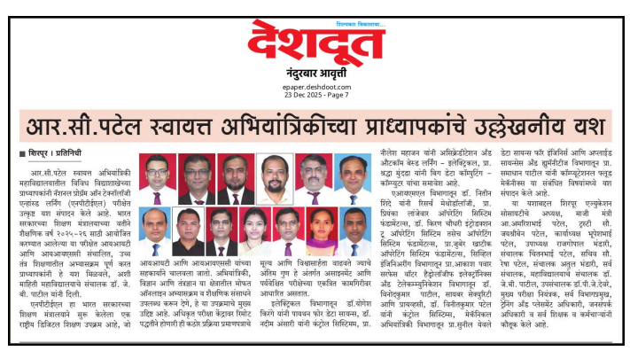 Faculty members of R.C. Patel Institute of Engineering have achieved remarkable success in academic and professional domains. Their excellence has been recognized through various achievements and contributions to education and research. The institution appreciated their dedication, hard work, and commitment to quality teaching. This accomplishment highlights the continuous efforts of faculty in enhancing academic standards. Senior authorities congratulated the staff for bringing pride to the institution. The success reflects the strong academic environment and support provided by the institute. It also motivates other educators to strive for excellence in their respective fields.