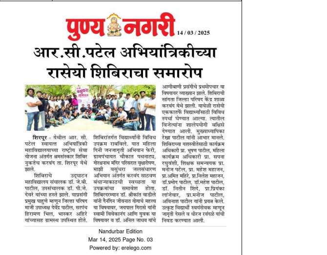 The NSS camp organized by R.C. Patel Institute of Technology, concluded successfully with active student participation. Various social and community development activities were carried out during the camp. Students engaged in awareness programs, cleanliness drives, and rural development initiatives. The camp aimed to instill social responsibility and teamwork among students. Faculty members and organizers appreciated the enthusiastic involvement of participants. The closing ceremony was attended by dignitaries who encouraged students to continue contributing to society. The camp proved to be a valuable learning and service experience for all participants.